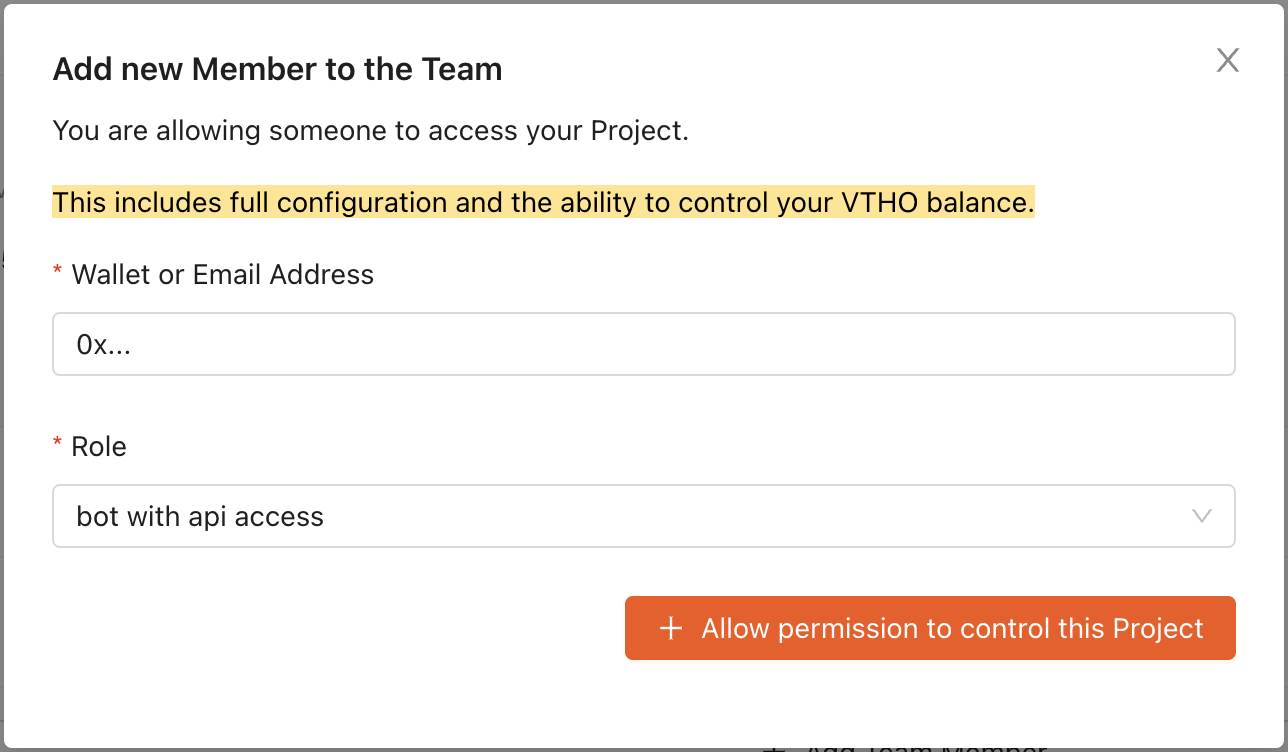 To gain access to the contract, add a wallet assigned the role bot to the team.