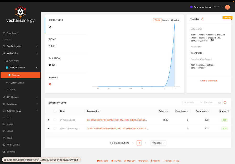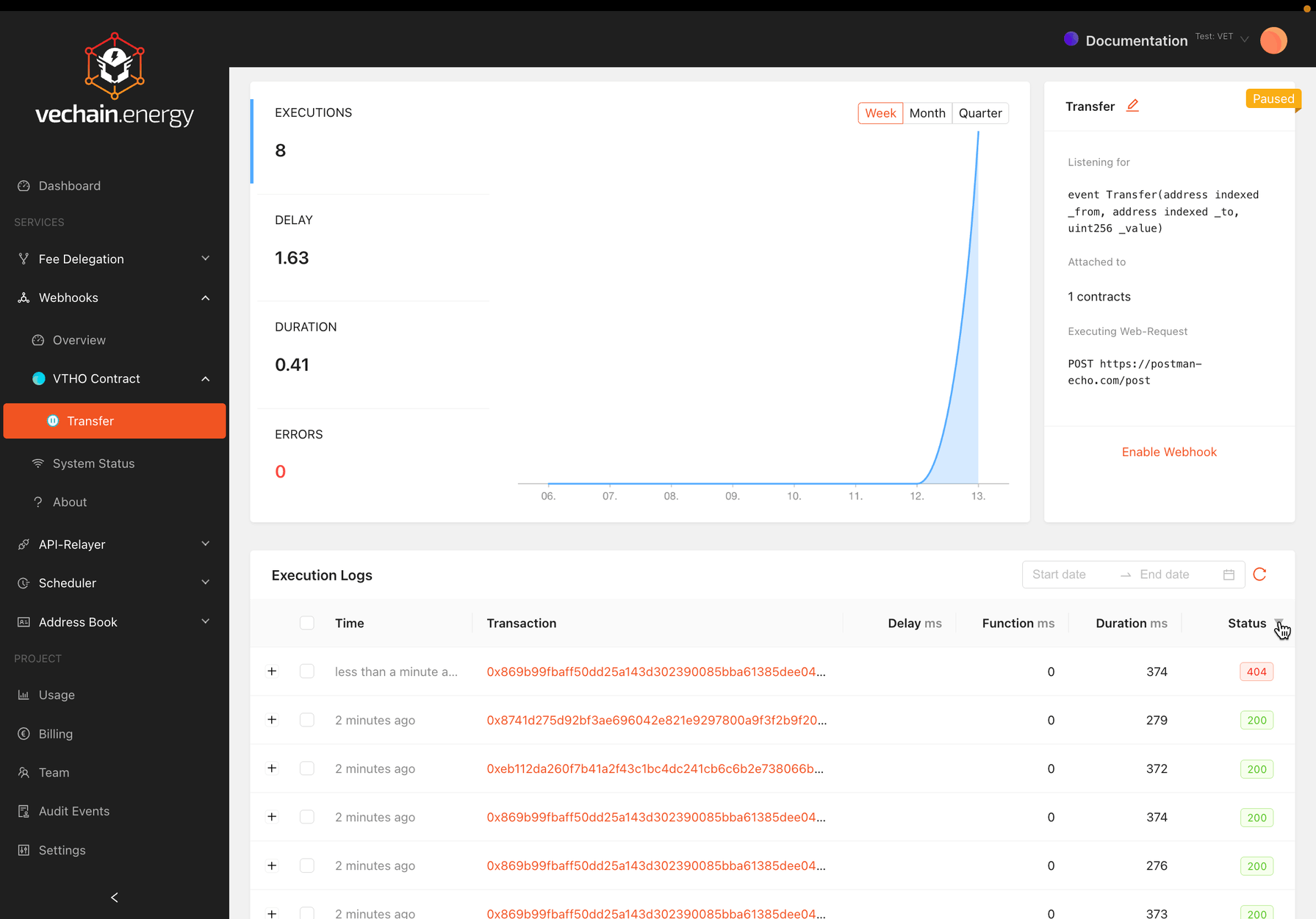 If the Webhook Function throws an error, the response status will be 503 and the error message is available in the logs.