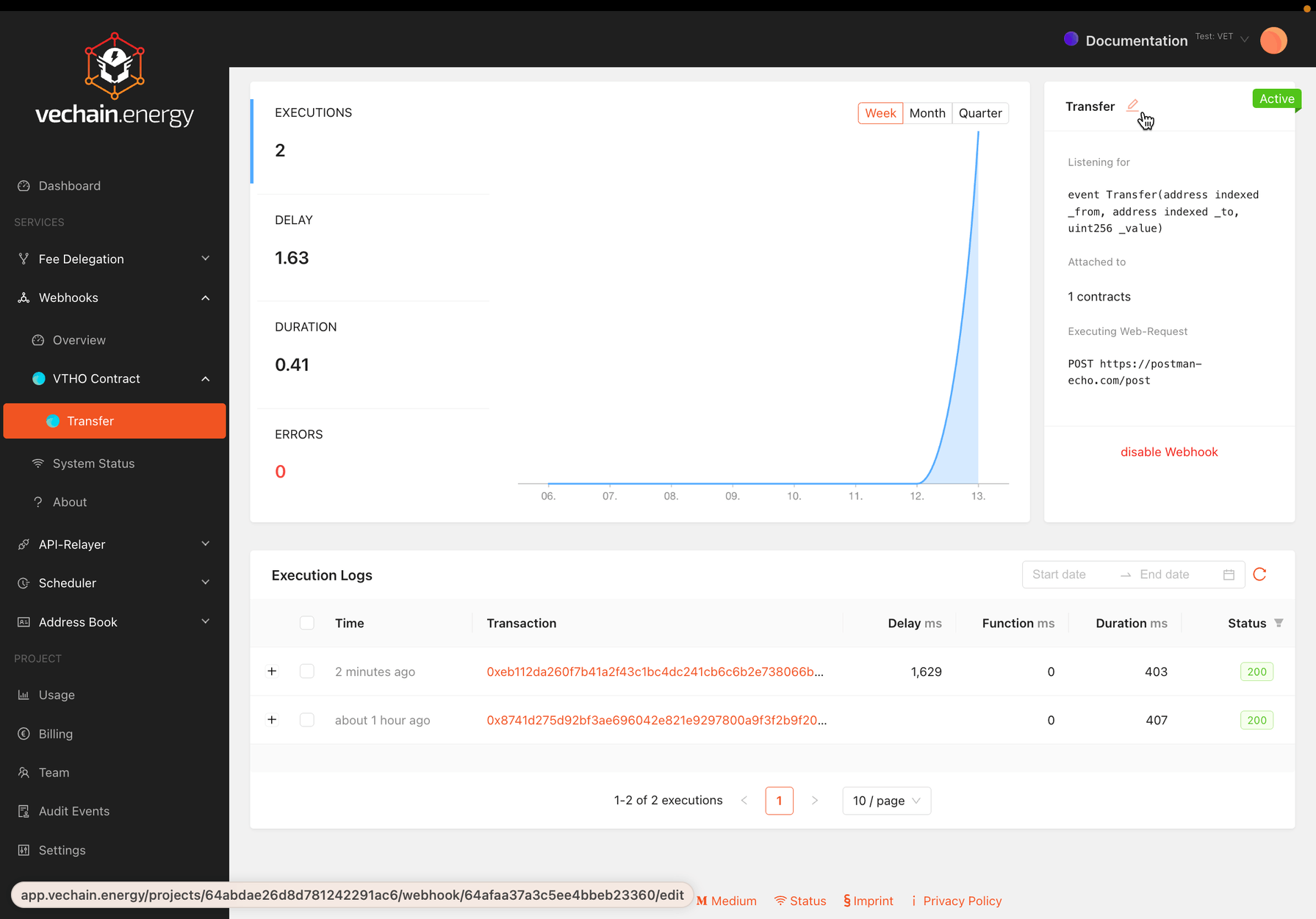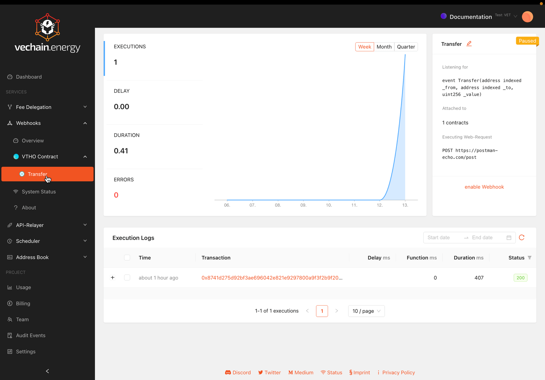 The Execution Logs in the Webhooks section provide a filterable list and additional details about each execution.